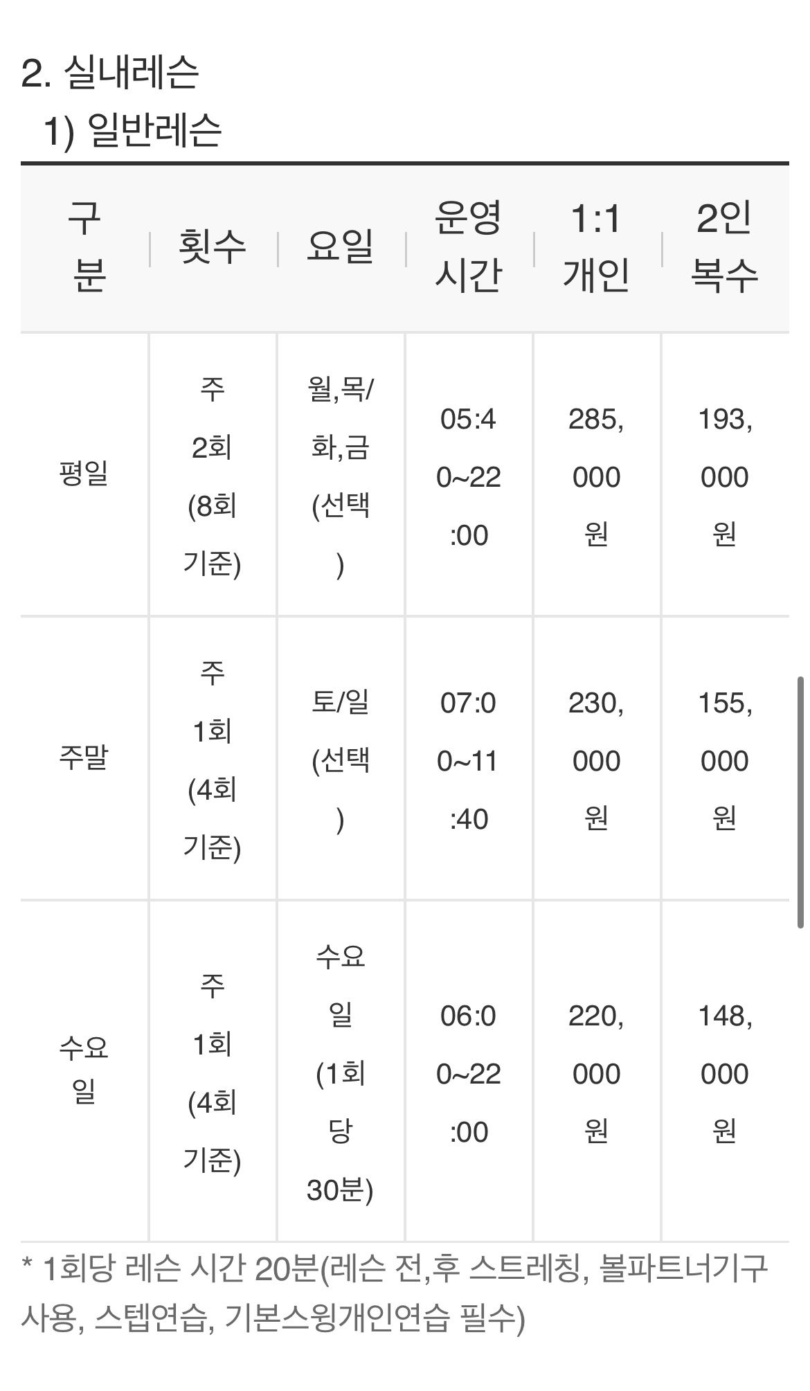 - 개인레슨: 1:1 맞춤형 레슨 (시간당 80,000원)