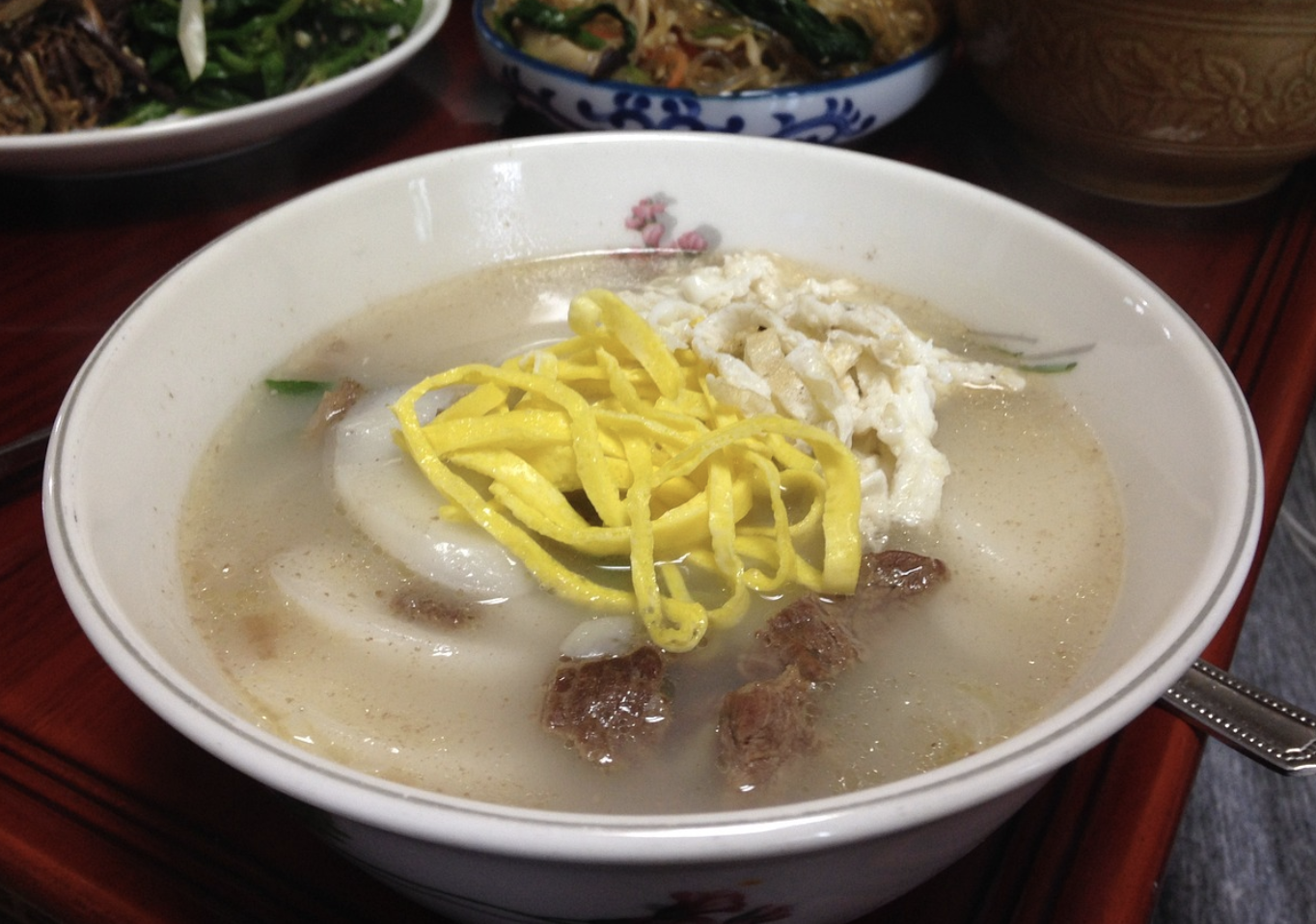 떡국 또는 한국 떡국은 설날에 꼭 먹어야 하는 음식입니다. 가족들은 떡국 한 그릇을 맛있게 먹으면 한국 전통에서 행운과 한 살 더 먹는 것을 상징한다고 믿습니다. 떡국에는 일반적으로 얇게 썬 떡, 진한 소고기 육수, 계란, 파, 김 등의 고명이 들어 있습니다.