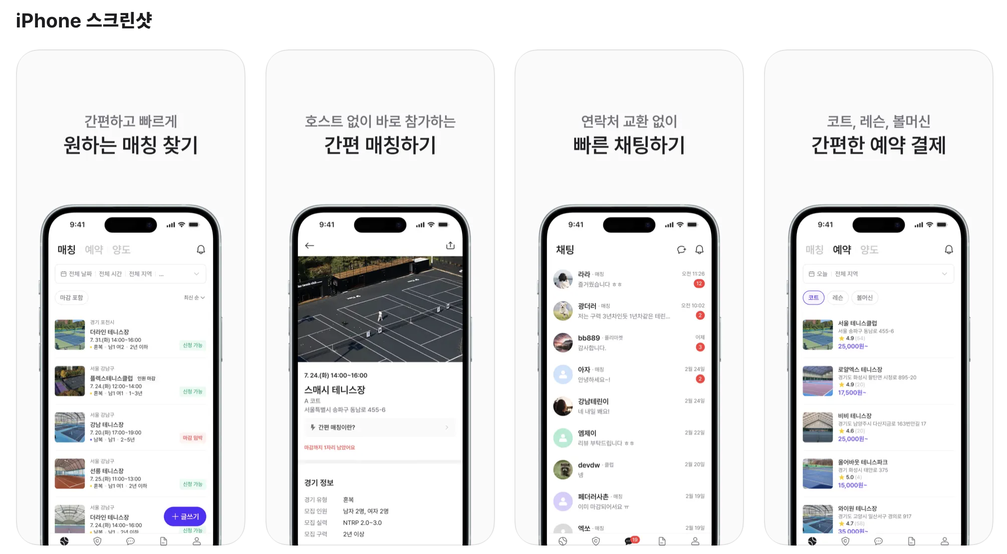 테니스 친구찾기부터, 테니스 코트 예약, 초보자를 위한 레슨 예약, 그리고 테니스 클럽 기능까지