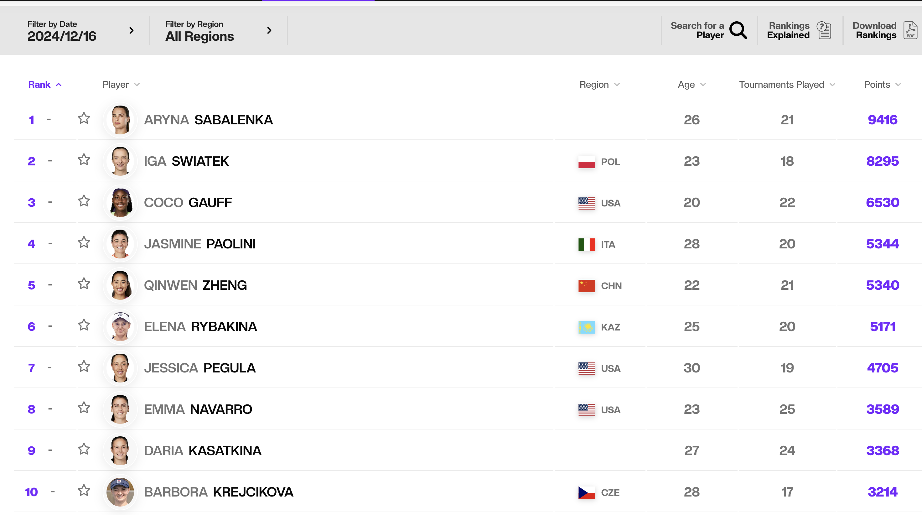WTA 랭킹은 지난 52주 동안 선수의 최고 성적인 16개를 집계합니다. 남자 투어와 마찬가지로, 이 결과에는 4개의 그랜드 슬램(선수가 출전하는 경우)과 선수가 참가한 필수 WTA 1000 토너먼트의 포인트가 포함되어야 합니다. 나머지 16개의 집계 가능한 결과는 다양한 레벨의 토너먼트에서 다음으로 좋은 성적을 거둔 것들로 구성됩니다.