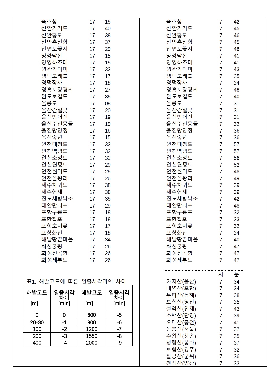 □ 발표한 일출시각은 해발고도 0m를 기준으로 계산된 시각으로 고도가 높을수록 일출시각이 빨라져 해발고도 100m에서의 실제 일출시각은 발표시각에 비해 2분가량 빨라진다. (붙임의 표1 참고)
