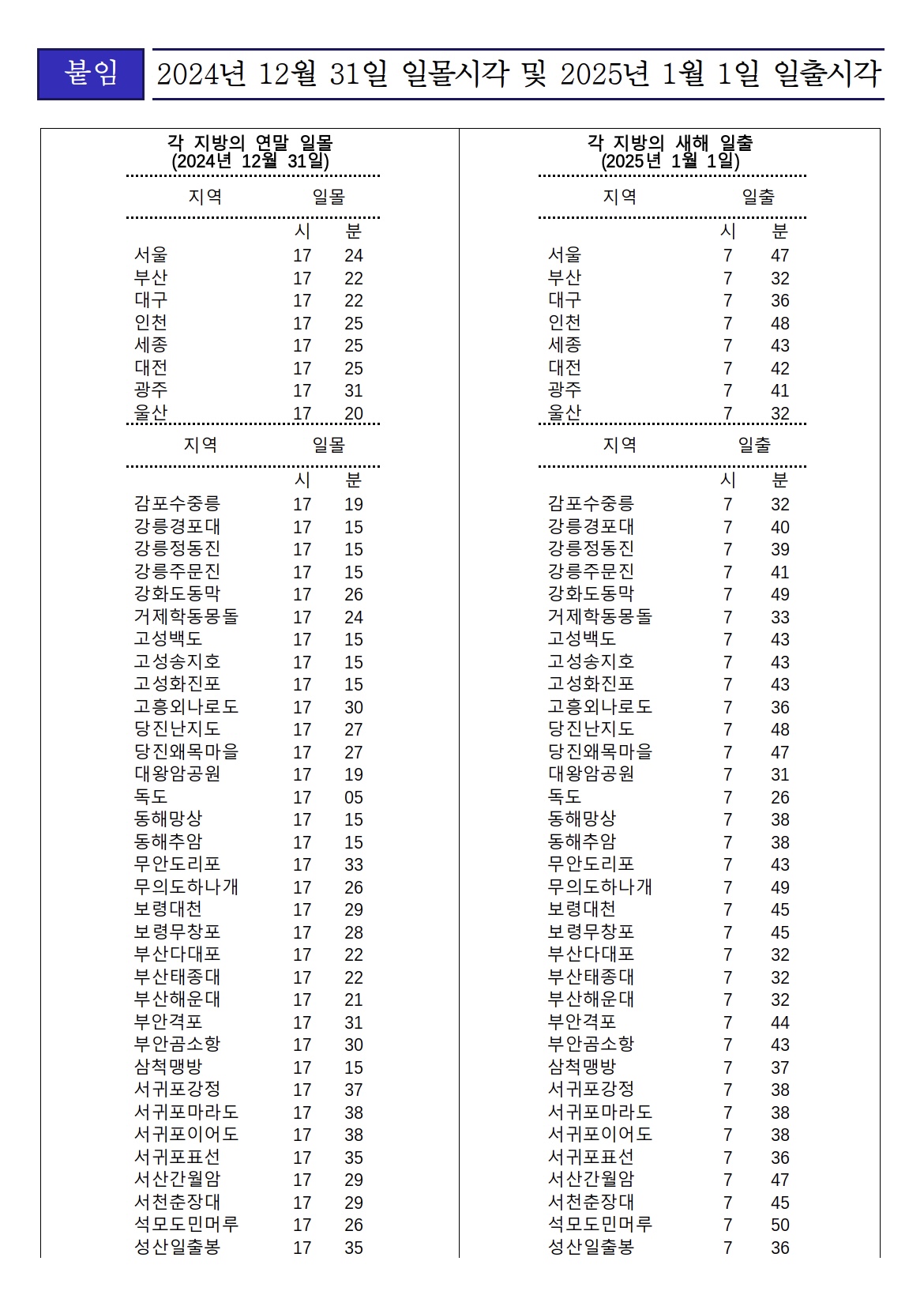 한국천문연구원은 주요 지역의 2024년 12월 31일 일몰시각 및 2025년 1월 1일 일출시각을 발표했다.